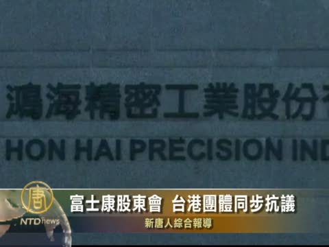 【新唐人2010年6月9日訊】臺資富士康與母公司鴻海精密星期二召開股東會議,這是在富士康深圳公司員工一系列跳樓自殺事件發生後的首次股東會議,台灣和香港一些團體同步舉行抗議活動,他們要求改善職工待遇而不是僅僅靠加工資解決。
