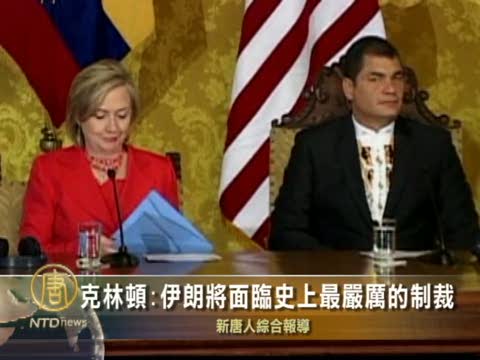 【新唐人2010年6月9日訊】隨著聯合國安理會即將對第四輪制裁伊朗的決議進行表決,美國國務卿希拉里•克林頓在星期二(6月8日)對此評論說,這將是到目前為止伊朗所面臨的最嚴厲的制裁。