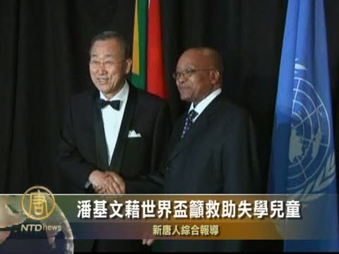 【新唐人2010年6月9日訊】聯合國秘書長潘基文於星期二(6月8日)出席了在南非城市約翰內斯堡舉辦的世界盃慈善歡迎晚宴。潘基文藉此機會呼籲各國共同努力救助所有失學兒童。
