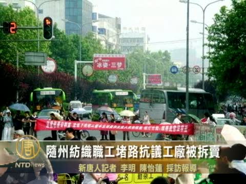 【新唐人2010年6月9日訊】湖北隨州市8號下起了滂沱大雨,鐵樹集團的”被下崗職工",堵路的抗議活動也因而暫停,據該廠職工透露,他們從這個月5號開始,以堵路的方式抗議工廠被拆賣後,職工沒有得到應有的補償。