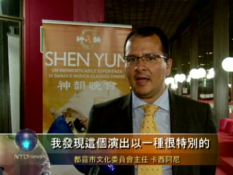 【新唐人2010年6月11日訊】神韻晚會在全球上演以來,不僅以其完美的舞臺藝術令各族裔的觀衆讚嘆,其深邃的內涵更是給無數人帶來內心的安寧。都靈市文化委員會主任說,神韻晚會傳遞了忍讓、和平及互相尊重的信息,觀看神韻為他帶來寧靜、寬容與和平。