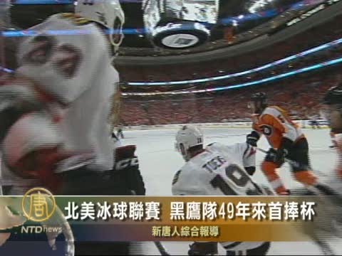 【新唐人2010年6月11日訊】北美冰球聯賽(NHL)斯坦利杯總決賽的冠軍,昨晚終於有了歸屬,在費城飛人隊主場和芝加哥黑鷹隊的第六場比賽中,黑鷹隊凱恩攻入制勝金球,在4-3獲得比賽勝利的同時,也以4-2的大比分獲得了這座對於冰球運動員來說的最高榮譽 斯坦利杯。