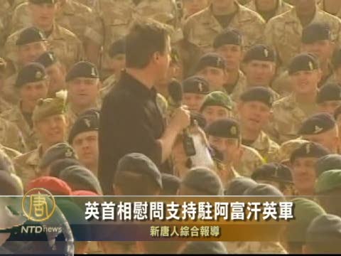 【新唐人2010年6月11日訊】英國首相戴維•卡梅倫(David Cameron),星期五(6月11號),到訪 駐阿富汗的英國軍事基地,慰問官兵,並表達支持。卡梅倫表示,對駐阿富汗的將士官兵感到驕傲,他們所做的偉大工作,將永遠不會被遺忘。