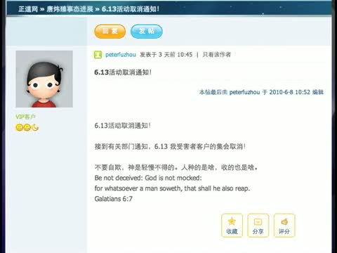 林先生說他們是應政府方面的建議 取消了6月13號的活動,但不便透露詳情。他也沒有透露是否還要繼續成立反唐基金,但表示他們創立的正道網 彙集了一批在加拿大、美國甚至大陸的唐煒臻的客戶。現在他們都很關心一個問題,就是唐煒臻有沒有違反保釋條例。