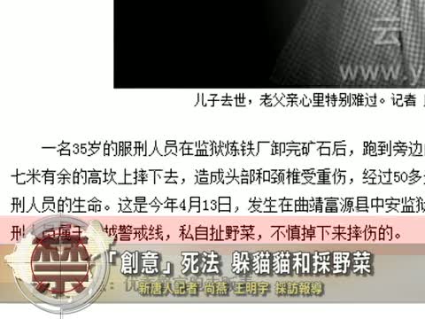 今年4月13號,雲南曲靖富源縣中安監獄一名35歲的余姓服刑人員死亡。官方聲稱,他是私自超越警戒線採野菜,不慎從高坎上掉下,摔傷頭部和頸椎,經搶救無效身亡。
