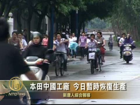 【新唐人2010年6月16日訊】位於廣東中山市小欖鎮的本田制鎖工廠,星期二(15號)暫時恢復生產。有工人表示,領導層週五會給出加薪幅度,之前會正常工作。