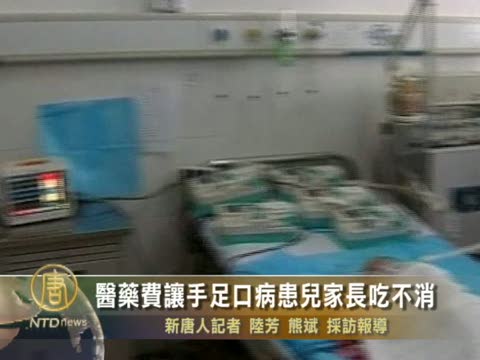【新唐人2010年6月17日訊】中國手足口病5月份起進入高峰期,近日有患兒家長反映,高額的醫藥費普通家庭感到吃不消,醫生甚至勸說繳不起醫藥費的家長放棄治療。