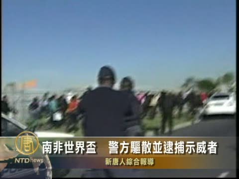 【新唐人2010年6月18日訊】南非世界盃球場保安人員的勞資糾紛,星期四進一步擴大。當天,警察在開普敦用眩暈手榴彈和橡皮子彈驅散了數百名非法示威者,並逮捕了幾人。