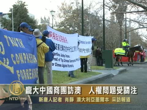 【新唐人2010年6月20日訊】6月19日,中國國家副主席習近平率領龐大的商業代表團訪問澳洲,首站墨爾本便遭遇當地法輪功人士的抗議活動。澳州政府在對華貿易和中共惡劣的人權記錄問題上的決策,再一次引起人們的關注。