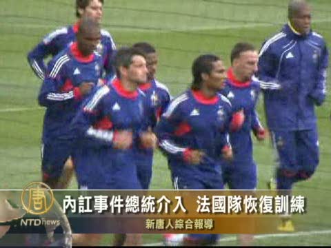 【新唐人2010年6月22日訊】法國隊在近日發生一系列內訌事件後星期一已經恢復了訓練,由於開除隊員阿內爾卡引起的一連串影響似乎已經告一段落,法國的球員們將專心備戰明天對南非的最後一場小組賽。