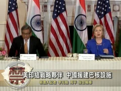 【新唐人2010年6月23日訊】美國和印度6月初在華盛頓舉行戰略對話,建立新的印美戰略夥伴關係。與此同時,中國新援建巴基斯坦兩座民用核反應堆,引發美國的爭議。國際分析人士認為,中國可能希望通過此舉牽制印度,傳達對美國的不滿,中巴與印美之間的對抗可能加劇南亞地區的紛爭。