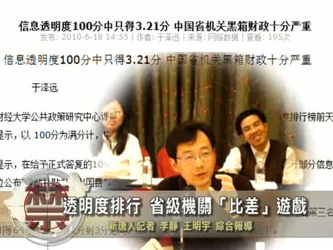 【新唐人2010年6月23日訊】信息公開是對一個現代政府的基本要求。最近,上海財經大學公共政策研究中心公布了《2010中國省級行政機關透明度排行榜》。排行榜顯示,以百分制計算,平均成績只有3.21分,面對如此難堪的低分,專家和網民質疑,難道這是一場省級行政機關的“比差”遊戲?