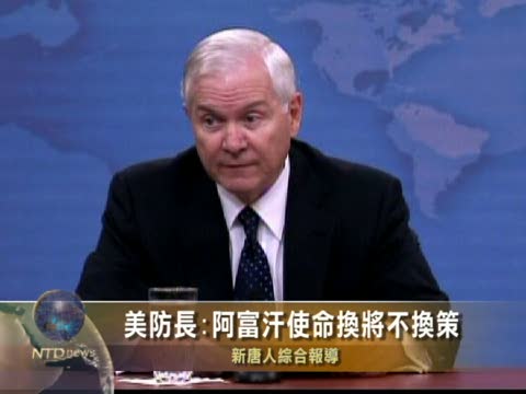 【新唐人2010年6月25日訊】在美國總統奥巴馬撤換駐阿富汗美軍最高指揮官後,美國國防部長羅布特•蓋茨(Robert Gates)週四(6月24號)表示,美國對阿富汗戰爭的策略仍然不變,履行阿富汗的使命也不會因此而放緩。