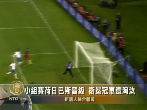 【新唐人2010年6月25日訊】6月24日,南非世界盃小組賽進入第14天,E組最後一輪荷蘭2比1戰勝喀麥隆,日本3比1戰勝丹麥﹔ 荷蘭小組第一、日本小組第二晉級16強。F組最後一輪比賽巴拉圭0比0打平新西蘭,斯洛伐克3比2戰勝意大利﹔巴拉圭和斯洛伐克分別位居小組第一、第二,晉級16強。