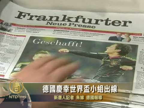 【新唐人2010年6月25日訊】德國隊戰勝迦納,以小組第一的成績出線,讓神經緊繃的德國民眾大大送了一口氣。請隨鏡頭到法蘭克福的一家售報亭去看看民眾的反應。