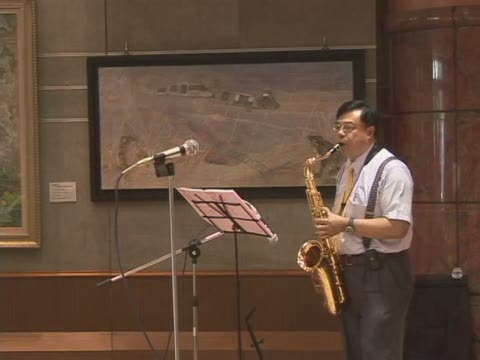 卸下平時的嚴肅,建國科大副校長江金山博士,為校內的膠彩畫展,獻上薩克斯吹奏,襯託這種典雅的重彩創作。