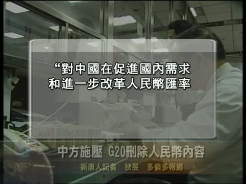 【新唐人2010年6月28日訊】原本很多人預測這次多倫多二十國峰會一個熱門話題是人民幣升值。但根據路透社報導,這部分內容在二十國峰會的公告文件中被臨時刪除了。分析人士相信這是中方不斷施壓的結果,同時也凸顯出中方對這個問題非常敏感。