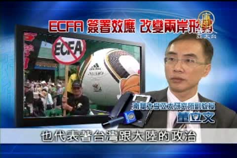 南華大學亞太研究所副教授 董立文:「ECFA是兩岸之間經貿談判的一個總的架構,這個總的架構也代表兩岸的經貿談判已經告一個段落,未來只是一些技術性的,這也符合說以前國共兩黨所說的兩岸關係先經濟後政治,先經濟的部分已經告一個段落,所以說北京這方面已經表達很明顯的要求,要求兩岸關係要走上政治協商,第二個涵意呢,就是後 ECFA時期也代表著台灣跟大陸的政治、經濟跟社會,已經被綑綁在一起了,所以換句話說,中國大陸的風險台灣也要承擔,未來無論是中國大陸的政治風險,經濟風險或者社會風險,它將會直接衝擊到台灣,現在看起來,因為馬政府他反對公投,所以人民意見沒有辦法代表關鍵的力量,無論是贊成或是反對,但是重點是他不讓人民有公投的機會,如果說讓人民有公投的機會,那麼無論是贊成或是反對,都可以代表說人民的意見產生了關鍵的力量,可是在這一次ECFA裡面,這一點是看不到的,這也是我一直覺得這是馬政府最大的失策 ,簽訂了ECFA也讓台灣朝野的對立更加的尖銳。」