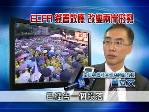 南華大學亞太研究所副教授 董立文:「ECFA是兩岸之間經貿談判的一個總的架構,這個總的架構也代表兩岸的經貿談判已經告一個段落,未來只是一些技術性的,這也符合說以前國共兩黨所說的兩岸關係先經濟後政治,先經濟的部分已經告一個段落,所以說北京這方面已經表達很明顯的要求,要求兩岸關係要走上政治協商,第二個涵意呢,就是後 ECFA時期也代表着台灣跟大陸的政治、經濟跟社會,已經被綑綁在一起了,所以換句話說,中國大陸的風險台灣也要承擔,未來無論是中國大陸的政治風險,經濟風險或者社會風險,它將會直接衝擊到台灣,現在看起來,因為馬政府他反對公投,所以人民意見沒有辦法代表關鍵的力量,無論是贊成或是反對,但是重點是他不讓人民有公投的機會,如果說讓人民有公投的機會,那麼無論是贊成或是反對,都可以代表說人民的意見產生了關鍵的力量,可是在這一次ECFA裡面,這一點是看不到的,這也是我一直覺得這是馬政府最大的失策 ,簽訂了ECFA也讓台灣朝野的對立更加的尖銳。」