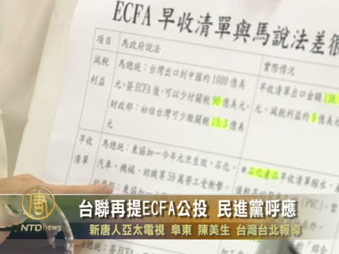 【新唐人2010年6月29日訊】第五次「江陳會」明天(6月29日)將在重慶簽署ECFA,臺聯也宣佈後天(30日)向中選會再提ECFA公投案,今天民進黨召開記者會,呼應臺聯所提出的訴求。