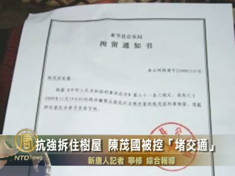 【新唐人2010年6月29日訊】因為對抗強制拆遷選擇住在樹上三個月,一舉聞名的重慶男子陳茂國,日前在重慶市奉節縣法院受審。當地檢察院認為陳茂國住在樹上是「聚眾堵塞交通」、「情節嚴重」,而陳茂國的家人和律師都對此表示不理解。