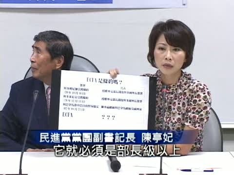 民進黨立法委員 陳亭妃:「由立法院來成立兩岸事務監督小組,來監督這個兩岸經濟合作委員會,難道就讓他們任憑半年協調一次,協議一次把台灣的權益都賣掉嗎?甚至也應該成立調閱委員會,我們隨時都可以去調閱ECFA的內容,還有談論過程,這才是真正監督。」