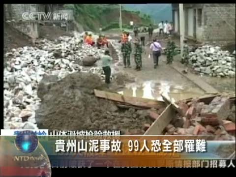 【新唐人2010年7月2日訊】貴州安順市大寨村發生山泥傾瀉的事故現場,至今已經發現13名遇難者的屍體,仍然有86人被埋。由於搶救的“黃金72小時”已過,有關人員表示他們可能已經遇難。安順市大寨村星期一因為暴雨導致山泥傾瀉,共有37戶人家共99名村民被掩埋。