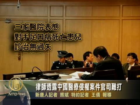 【新唐人2010年7月3日訊】中國陝西手足口病死亡病例3歲的小波,前年被西安三大醫院誤診,耽誤病情後死亡,死者家屬狀告三家大醫院,委託律師姚敏利透露中國醫療侵權案件,打官司十分艱難。