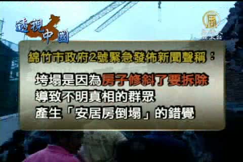 汶川5.12地震重災區錦竹漢旺鎮,日前再度發生塌樓事件,一座基本完工的新建安居樓突然整體垮塌,當地居民懷疑這又是一個豆腐渣工程。不過當地政府澄清說,當時是建築公司正在「拆房」。
