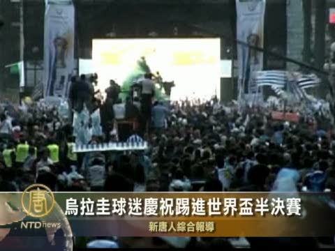 【新唐人2010年7月4日訊】烏拉圭隊星期五(7月2號)經過點球大戰戰勝非洲勁旅加納隊,成功踢進世界杯半決賽。烏拉圭首都蒙得維的亞變成了歡樂的海洋,球迷們慶祝這個等待了40年的好消息。