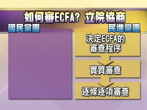 ECFA怎麼審,臨時會何時開,國、民兩黨在審查程序上各持己見,民進黨要求逐條逐項實質審查,包括舉行公聽會讓各方發表意見進行修正,而國民黨希望全部逕付二讀。兩黨首次協商沒有結論。
