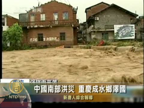 【新唐人2010年7月10日訊】中國南方好不容易擺脫酷熱天氣,近日安徽、浙江、湖北、湖南等9省又出現今年以來最強的大範圍持續性暴雨天氣,山洪和山體滑坡至少造成27人死亡,十萬多災民緊急轉移到地勢較高的地區,位於西南方的重慶災情嚴重,幾乎變成水鄉澤國。
