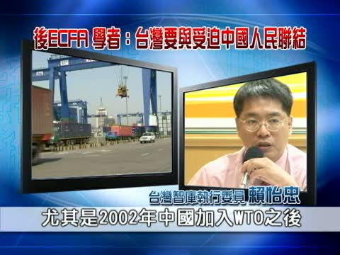 台灣智庫執行委員賴怡忠: 「我是覺得另外一個趨勢,對我們有利的是在哪裏,是因為說現在基本上全世界,在過去全世界都認為中國的經濟,尤其是2002年中國加入WTO之後,所有的跨國公司都到中國去發展,認為中國是遍地黃金,可是從今年的一月開始,開始很多的公司,對中國內部的經濟發展,抱持高度疑慮的態度,這一方面跟中共政府它的重商主義、它排斥外國公司扶持本國產業, 以及它種種不透明的經濟作業有十分的關係,那這個作為又因為它們政治不民主,使它們面對社會問題的時候,還再依賴這種對外面採取歧視的作為,來保護自己會更為強化,所以它們內部的矛盾,現在變成說連過去支持中國的跨國公司,那些經濟體,他們現在都對中國採取批判的態度,那麼也因此,我是覺得說,看到 ECFA,不是有甚麼兩岸經濟委員會嗎?這個委員會一定會變成甚麼,一定會變成兩岸的太子黨,或利益的權貴集團互相勾結,而且會搜刮台灣人民與中國人民的血汗的這樣的一個機制,也因此,如果說我們有辦法,特別是對我們在處理臺海問題的時候,一併能夠幫助中國處理它們自己內部的貪腐問題的一個助力的時候,我們到時候爭取到的,我們所面對的就不會是說,是國共對台灣然後我們完全沒有辦法,而我們會有13億人民跟我們站在一起,合作對抗國共兩黨不僅要主宰臺海,而且要國共兩黨進行,對台灣人民以及對中國人民的權益,以及利益上面的剝奪,那這個樣子的話,我們自然有辦法爭取中國內部很重要的援軍。」