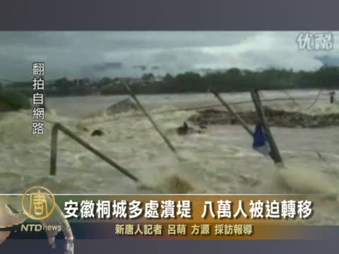 【新唐人2010年7月13日訊】7月以來中國南方持續洪澇,安徽等9省市受災嚴重,長江沿線流域水位暴漲,安徽省桐城市大沙河青草河段、柏年河段,11號當天多處發生潰堤,城市青草鎮八萬村民一度被困,還好目前險情已經獲得控制。