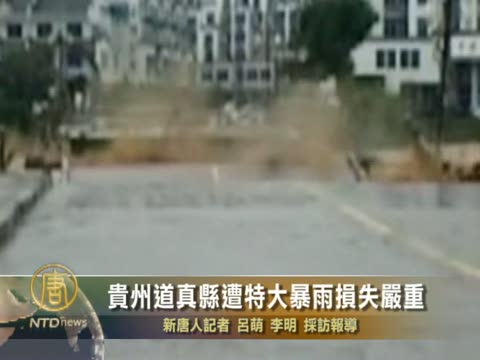 【新唐人2010年7月13日訊】貴州省遵義市道真縣最近連日遭到暴雨襲擊,全縣14個鄉鎮降雨量都在100毫米以上,最高的地方還達到209毫米,暴雨導致道路嚴重損壞,有12個鄉鎮因此交通中斷,加上莊稼受災嚴重,災區民眾相當擔心物價會上漲。