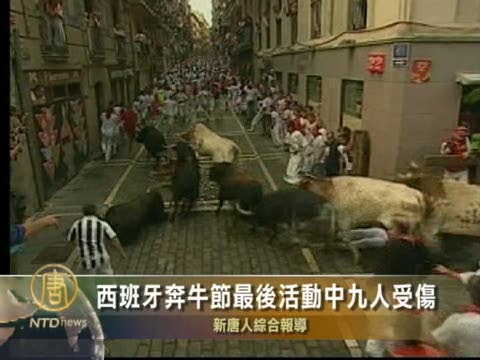 【新唐人2010年7月15日訊】西班牙聖佛明節,即奔牛節,已經接近尾聲,7月14日有9人在最後的奔牛活動中受傷,其中3人遭公牛頂刺。