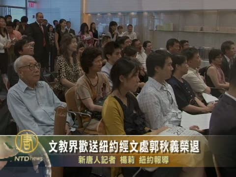 【新唐人2010年7月15日訊】星期二(7月13日)傍晚,美東地區的一百多位文教界人士,在駐紐約臺北經濟文化辦事處大樓內,歡送文化組郭秋義主任榮退離任。