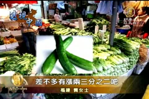 福建 龔女士:「青菜幾乎都漲,沒有一倍,也有三分之二,小黃瓜將近兩塊多吧,差不多有漲兩三分之二吧,有的青菜比肉類的菜更貴,芹菜幾毛錢,這一兩年時間狂漲,四、五塊錢一斤,蒜薹六塊多一斤。」
