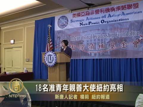 【新唐人2010年7月16日訊】國際領袖基金會“國際傑出青年培訓計劃”的2010年國際傑出青年親善大使培訓活動,7月14日正式從紐約開鑼。18名來自海峽兩岸的優秀大學生將在美國完成為期二周的國際事務與領袖領導的培訓,請看詳細報導。
