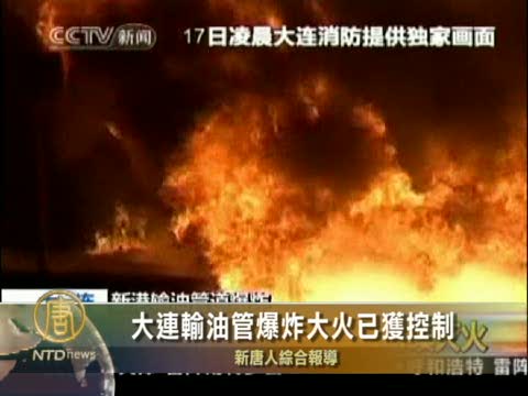 【新唐人2010年7月17日訊】中國大連市新港碼頭一條儲油罐輸油管星期五(16日)晚發生起火爆炸事故,隨後引發附近的一條管道發生大火。星期六早上火勢已被控制住,目前沒有造成人員傷亡。