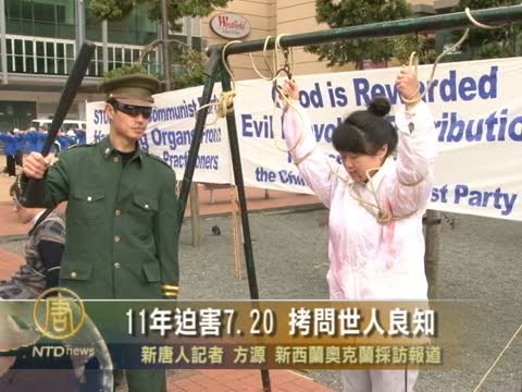 【新唐人2010年7月17日訊】7月17日新西蘭奧克蘭伊麗莎白廣場,當地法輪功學員通過煉功,酷刑展和圖片展告訴世人,中國大陸法輪功學員遭受的殘酷迫害已達十一個年頭,也再一次呼喚著世人的良知。