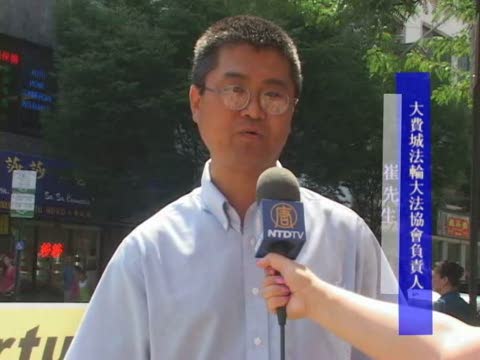 大費城法輪大法協會負責人崔先生:「1999年7月20號,中共開始迫害法輪功。到7.20已經是十一年了。所以我們在這里讓大眾知道,迫害還在繼續,呼籲中國民眾,中國城的民眾,和費城的民眾都能聯合起來,和我們一起抗議對法輪功的迫害,幫助我們停止對法輪功的迫害。」