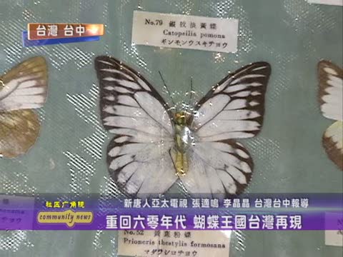 【新唐人2010年7月18日訊】台灣早期有「蝴蝶王國」的美名,大約每一萬平方公里的土地上,就有110種蝴蝶﹔不過由於社會變遷,土地開墾,使得蝴蝶的資源匱乏。臺中科博館和各界,籌畫展出了「蝴蝶主題館」,重溫有蝴蝶隨身相伴的美麗。