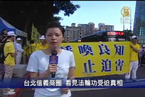 記者:「這裡是台北市人潮最熱鬧的信義商圈,下午,法輪功學員在這裡舉辦了一場名為「呼喚良知 停止迫害」的遊行活動,來悼念720反迫害十一年。」
