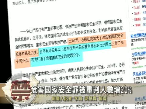 【新唐人2010年7月20日訊】中共當局推出了第一份法院工作的年度報告,報告中指出,由於國內外政經形勢的不穩定,增加了危害國家安全的因素。因此要嚴懲罪犯,確保國家安全和政權穩定。大陸有多位律師表示,國家安全罪名常常被一些司法部門濫用。