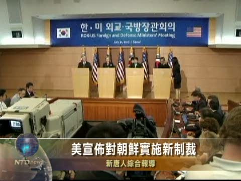 【新唐人2010年7月21日訊】正在韓國訪問的美國國務卿希拉里.克林頓星期三(7月21日)宣佈美國對朝鮮的新制裁,以阻止其挑釁活動,並迫使朝鮮停止其核武計劃。