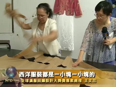 全球漢服回歸設計大獎賽專案經理王文花說:「你看喔,這個漢服(打版)跟一般西洋服裝(打版)是不一樣的,西洋服裝都是一小塊一小塊的,很省布啦,可是,漢服真的是一大片一大片的。」