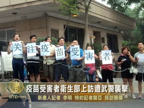 【新唐人2010年7月22日訊】9名疫苗受害兒家長,星期天在北京衛生部門前,用鐵鏈拴在一起,打著標語,要求官方重視疫苗受害兒問題﹔幾個小時後一群警察出現,大打出手,9人集體被抓,其中4人還被打傷,目前家長全部與外界失去聯繫。