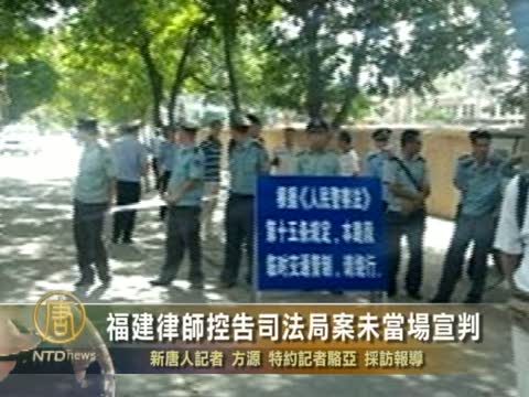 【新唐人2010年7月24日訊】福建律師林洪楠狀告福州司法局案,星期四下午在福州臺江區法院開庭,庭審後宣佈擇日宣判。辯護律師透露,庭審當天法院內外戒備森嚴,有幾十名警察及便衣在法院外監控到場聲援的民眾,附近商店也都被強迫關門休息。