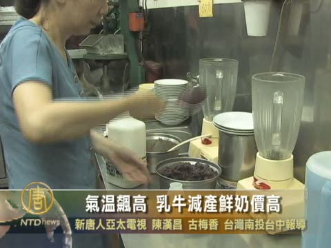 【新唐人2010年7月25日訊】台灣連日高溫,造成乳牛食慾大減,乳汁分泌減少,平均每頭乳牛的乳產量少了2公斤,奶量供應硬生生少了2成,加上民眾夏季需求又增加,導致鮮奶大缺貨,這給民眾和冰品冷飲、糕餅業者帶來了一些不方便。